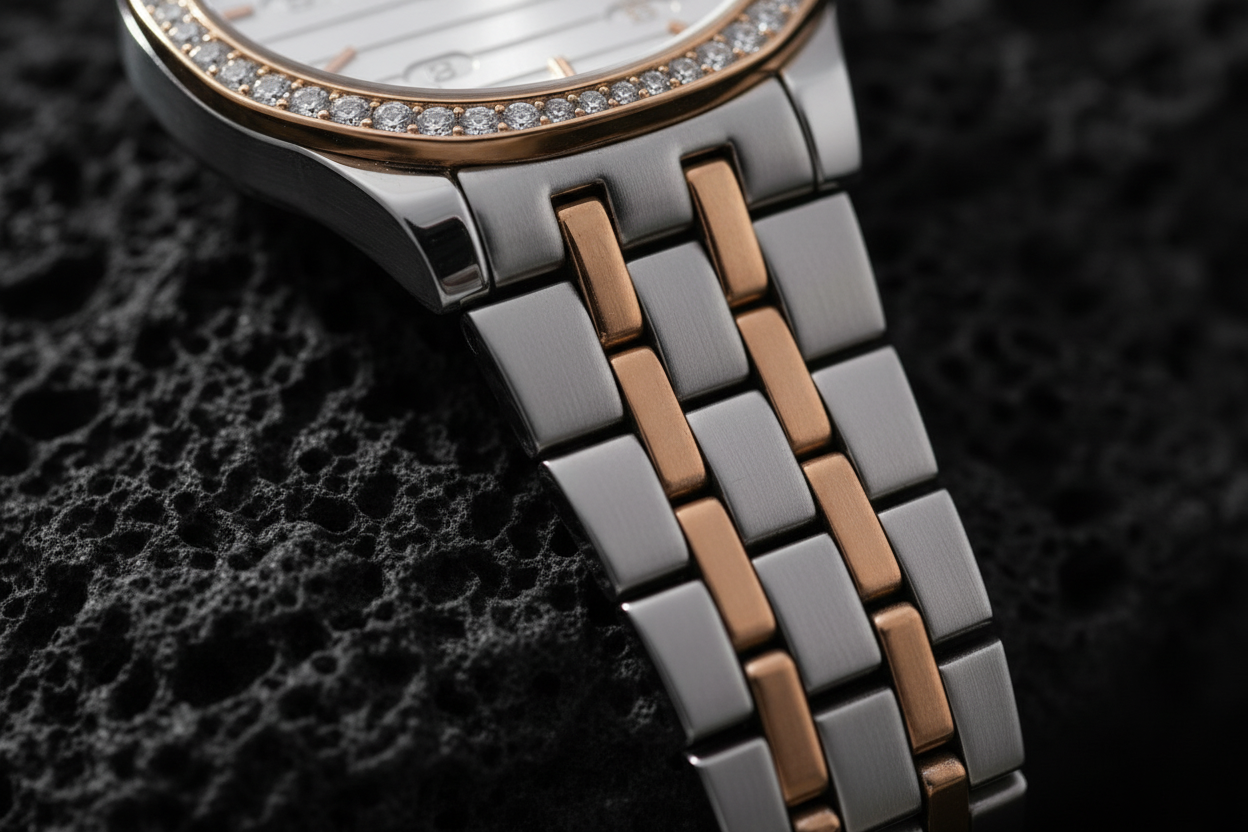 This elegant timepiece is crafted in stainless steel with rose gold accents, combining durability with refined style. The bezel is set with 3.1 carats of Lab-Created Diamonds, adding a subtle yet striking brilliance.