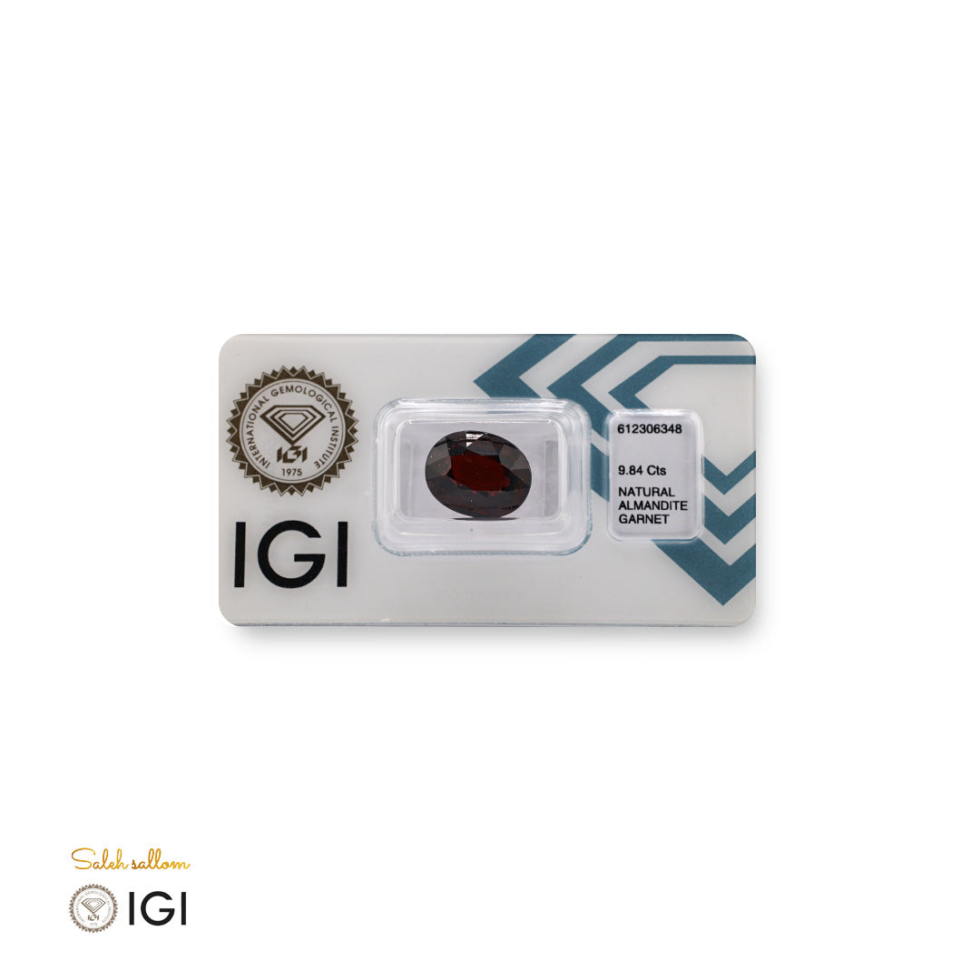 This Natural Almandite Garnet (9.84 carats) embodies the essence of deep elegance and timeless power. Certified by the International Gemological Institute (IGI), it is a gemstone revered for its intense wine-red hue with subtle undertones of violet and mahogany — a classic representation of strength, vitality, and refinement.