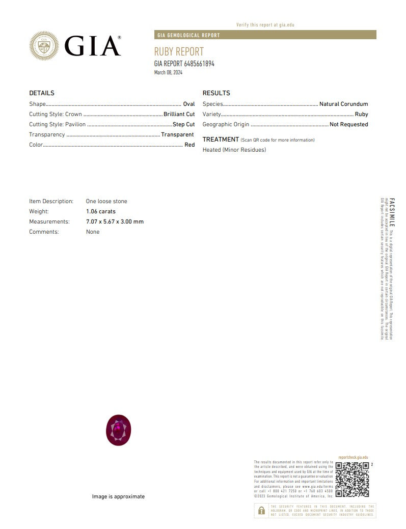 This 1.06 Ct natural ruby, certified by the Gemological Institute of America (GIA), radiates a vivid, passionate red — the hallmark of true corundum excellence. Its fine brilliance, transparency, and balanced oval cut make it a timeless representation of luxury and rarity, embodying the eternal allure of the ruby — a symbol of vitality, power, and love.