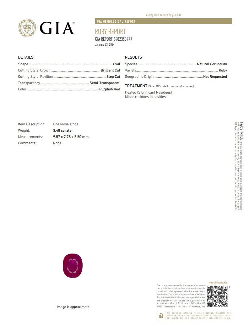 A stunning 3.48-carat natural ruby, certified by the Gemological Institute of America (GIA), radiating an exquisite purplish-red hue that embodies both warmth and elegance.