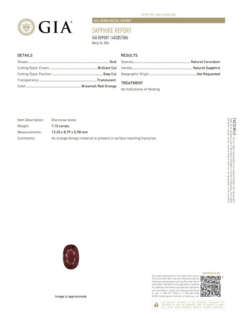 An extraordinary 7.10-carat natural sapphire, certified by the Gemological Institute of America (GIA), exhibiting a uniquely earthy brownish red-orange hue — a tone that captures the essence of autumn sunlight over volcanic soil.