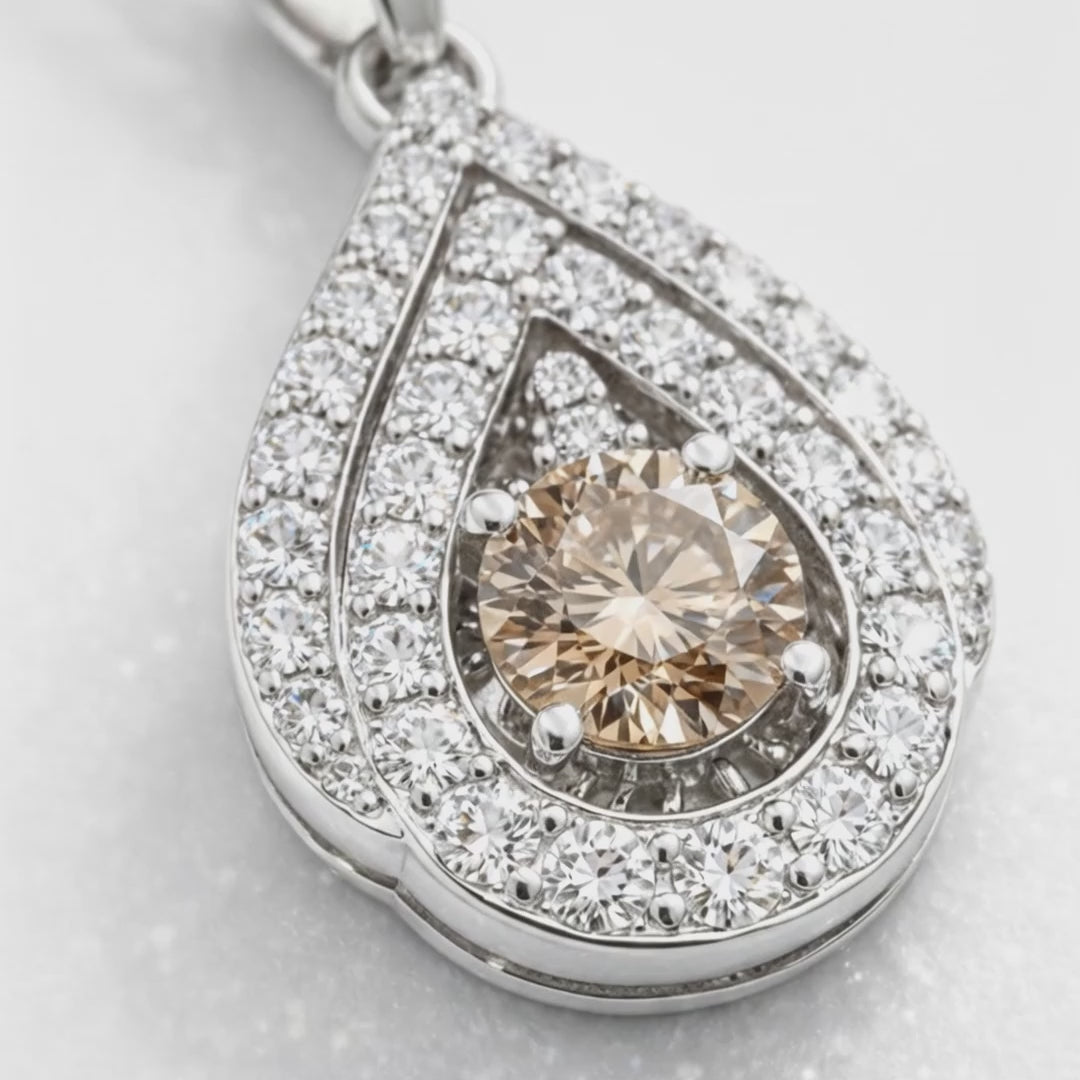 A refined and elegant pendant necklace crafted in luminous 18K white gold, featuring a captivating round brilliant natural brown diamond at its center. The warm champagne tone of the diamond is beautifully framed by a delicate teardrop-shaped halo of sparkling natural white diamonds, creating depth, contrast, and timeless appeal.